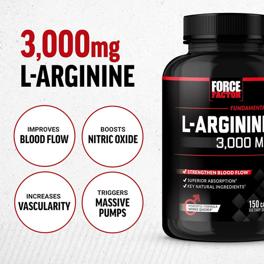 FORCE FACTOR L-Arginine Nitric Oxide Supplement with BioPerine to Help Build Muscle and Support Stronger Blood Flow, Circulation, Nutrient Delivery, and Pumps, L-Arginine 3000mg, 3g, 150 Capsules