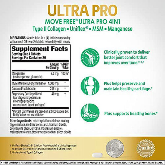 Move Free Ultra Pro with Quadruple Action Joint Support - Type 2 Collagen MSM Calcium Fructoborate & Manganese - Supports Joint Cartiliage Bone Connective Tissue, 120 Tablets (30 servings)