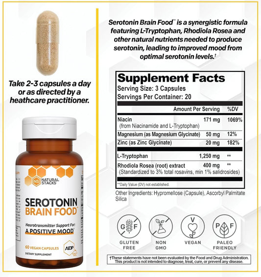 NATURAL STACKS Serotonin w/L Tryptophan & Rholiola - Mood Support & Serotonin Supplement - Promotes Positive Mood, Calmness, Increased Energy - Happy Mood & Brain Support Supplement (60ct)