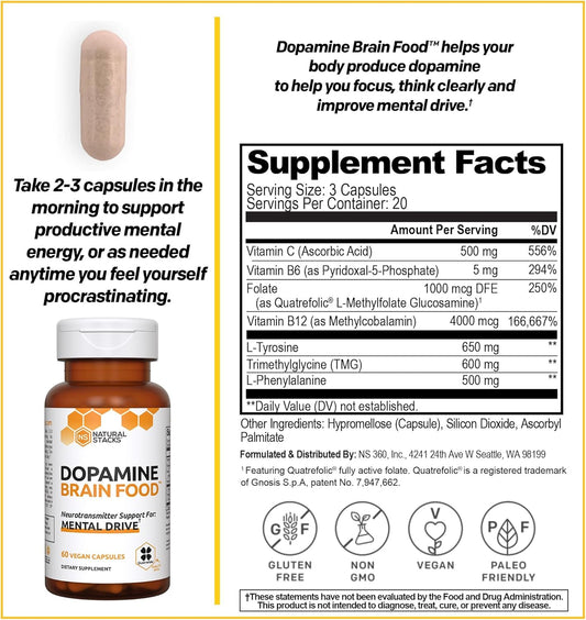 • NATURAL STACKS Dopamine Focus Supplement & Memory Supplement for Brain w/ L-Tyrosine - Promotes Mental Drive, Clarity & Focus - Natural Dopamine Supplements & Mood Support Supplement, 60 Vegan Capsule
