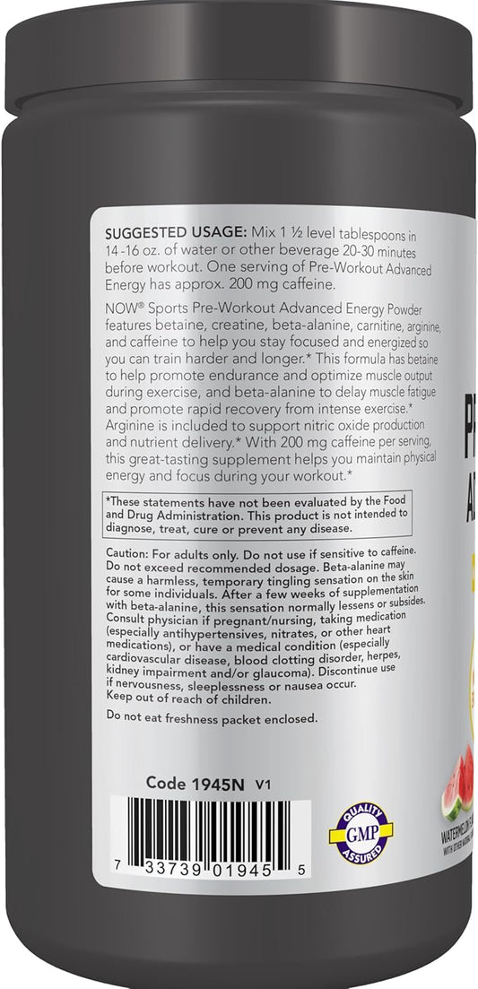 NOW Sports, Pre-Workout Advanced Energy Supplement, Watermelon Flavor, 21.16 oz