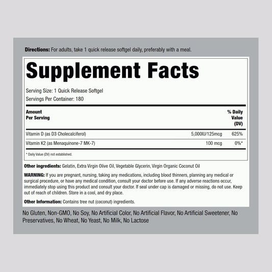 • Piping Rock Vitamin K2 MK7 with D3 | 180 Capsules | 800 mcg Complex | Vitamin D3 5000 IU | Non-GMO, Gluten Free