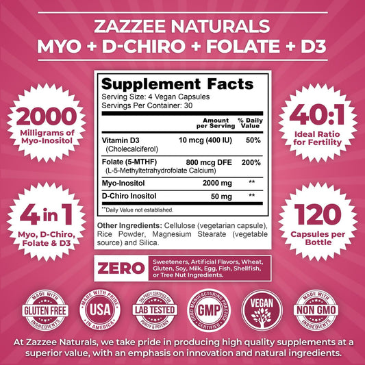 • Zazzee Naturals Myo-Inositol + D-Chiro, with Folate (5-MTHF) + D3, 120 Vegan Capsules