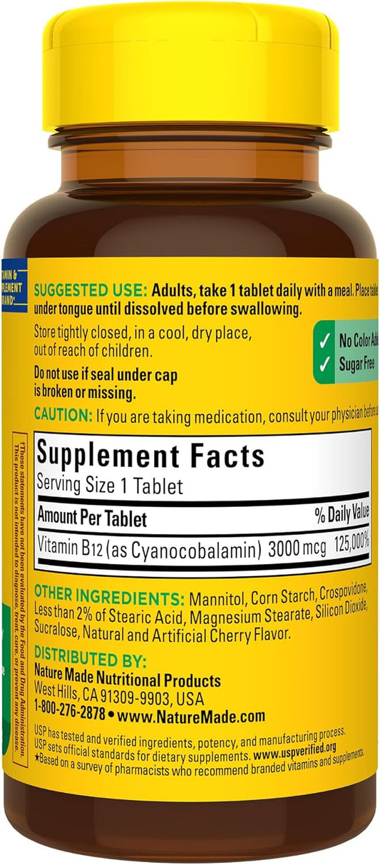 • Bottle of Nature Made Vitamin B12 3000 mcg fast dissolve tablets with cherry flavor, containing 40 tablets.