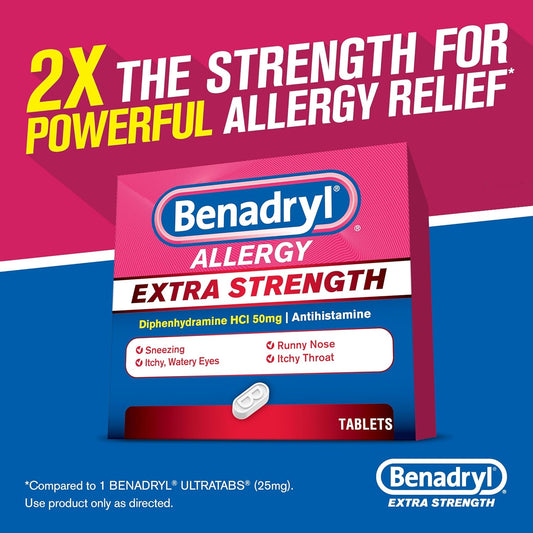 • Benadryl Extra Strength Antihistamine Allergy Relief Medicine, 50 mg Diphenhydramine HCl Tablets 24 ct