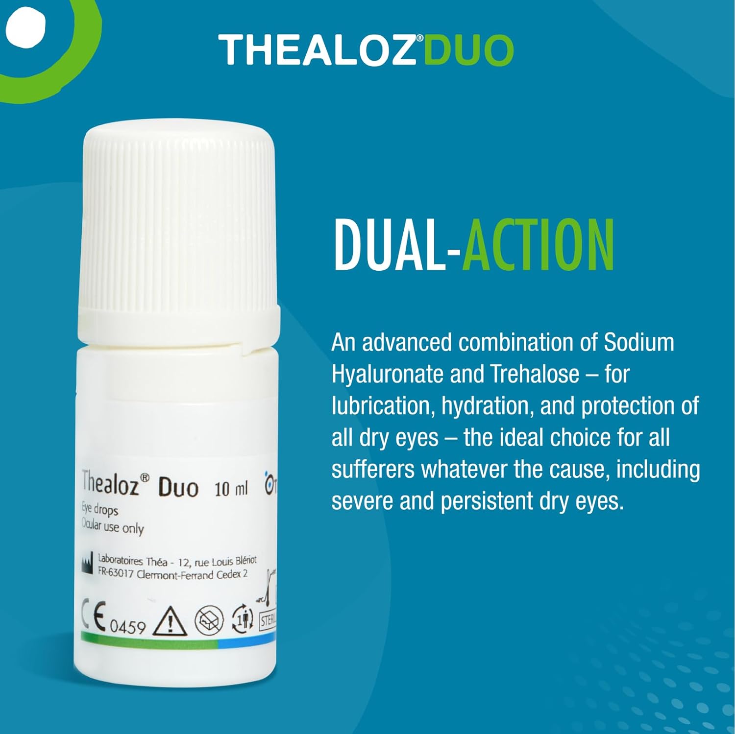 THEALOZ DUO hypotonic solution is a dual combination of trehalose and hyaluronic acid. It protects, hydrates and lubricates the eyes for treatment of moderate to severe dry eye syndrome: