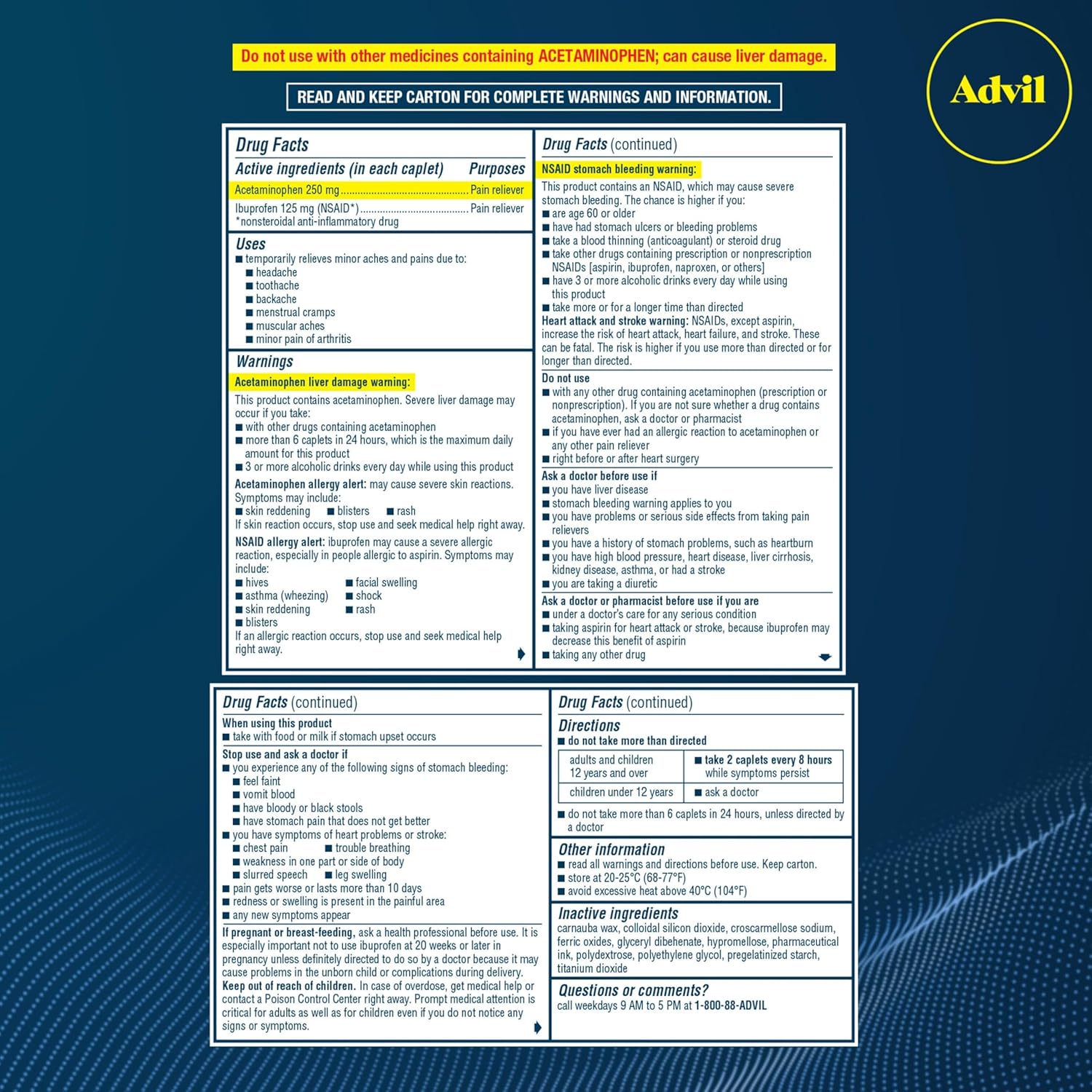 - Advil Dual Action coated tablets relieve pain with ibuprofen to target pain at the source and acetaminophen to block pain signals, and new packaging will feature 20 percent less plastic to keep nearly 500,000 pounds of plastic out of landfills