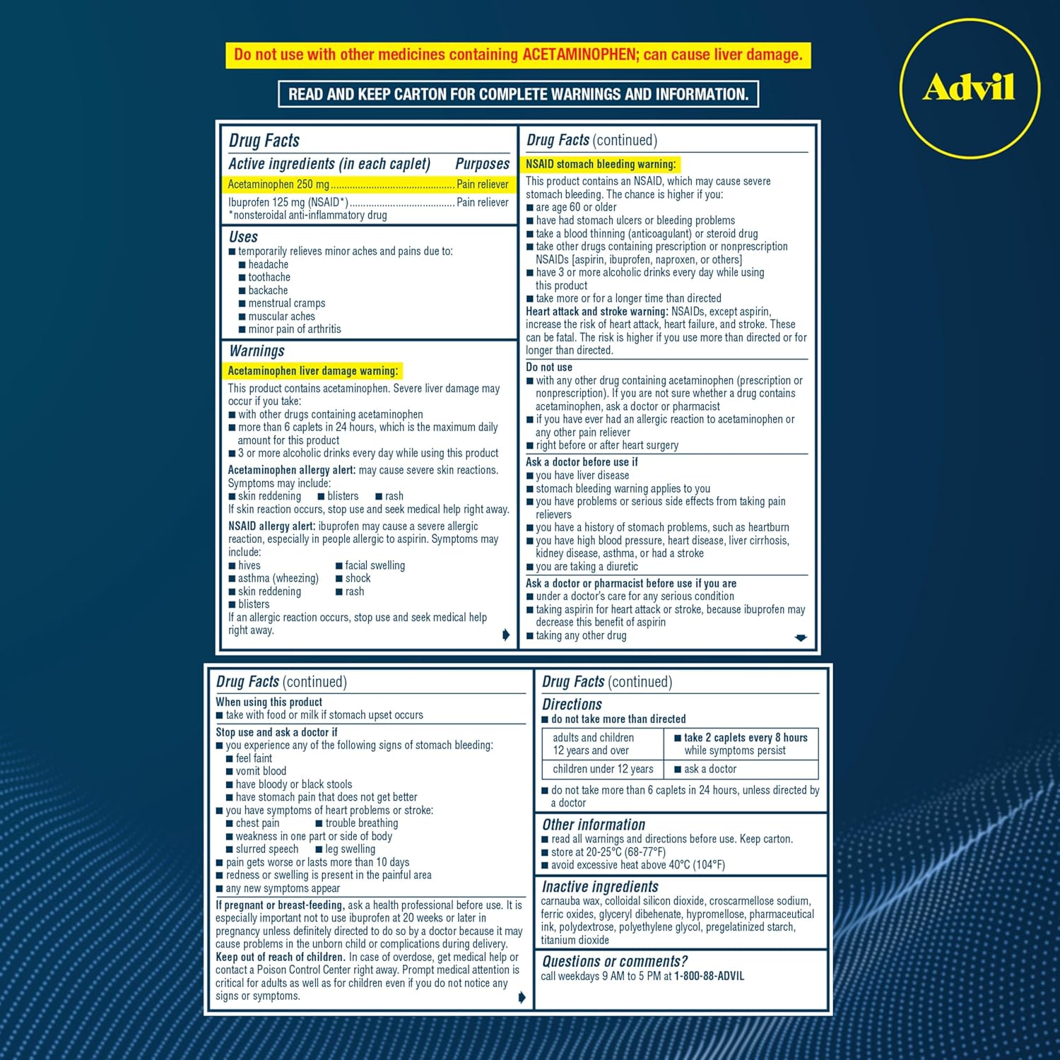 - One box of 72 Advil Dual Action Coated Caplets with Acetaminophen, 250 Mg Ibuprofen and 500 Mg Acetaminophen Per Dose (2 Dose Equivalent) for 8 Hour Pain Relief