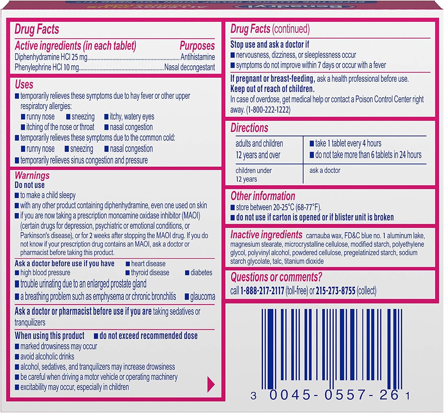- This allergy medicine contains 25 mg of the antihistamine diphenhydramine HCl & 10 mg of the nasal decongestant phenylephrine HCl in every allergy relief tablet that work to help alleviate sinus congestion & allergy symptoms