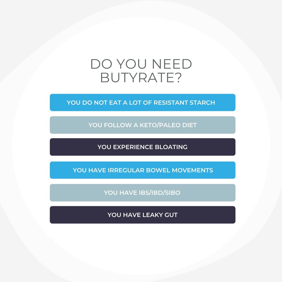 - No Fillers or additives: There is no way to achieve the powerful benefits of Butyrate without its distinctive, fermented scent. We do not use fillers or additives. All natural ingredients and free of wheat, gluten, yeast, corn, soy, dairy, artificial colors, and resins.