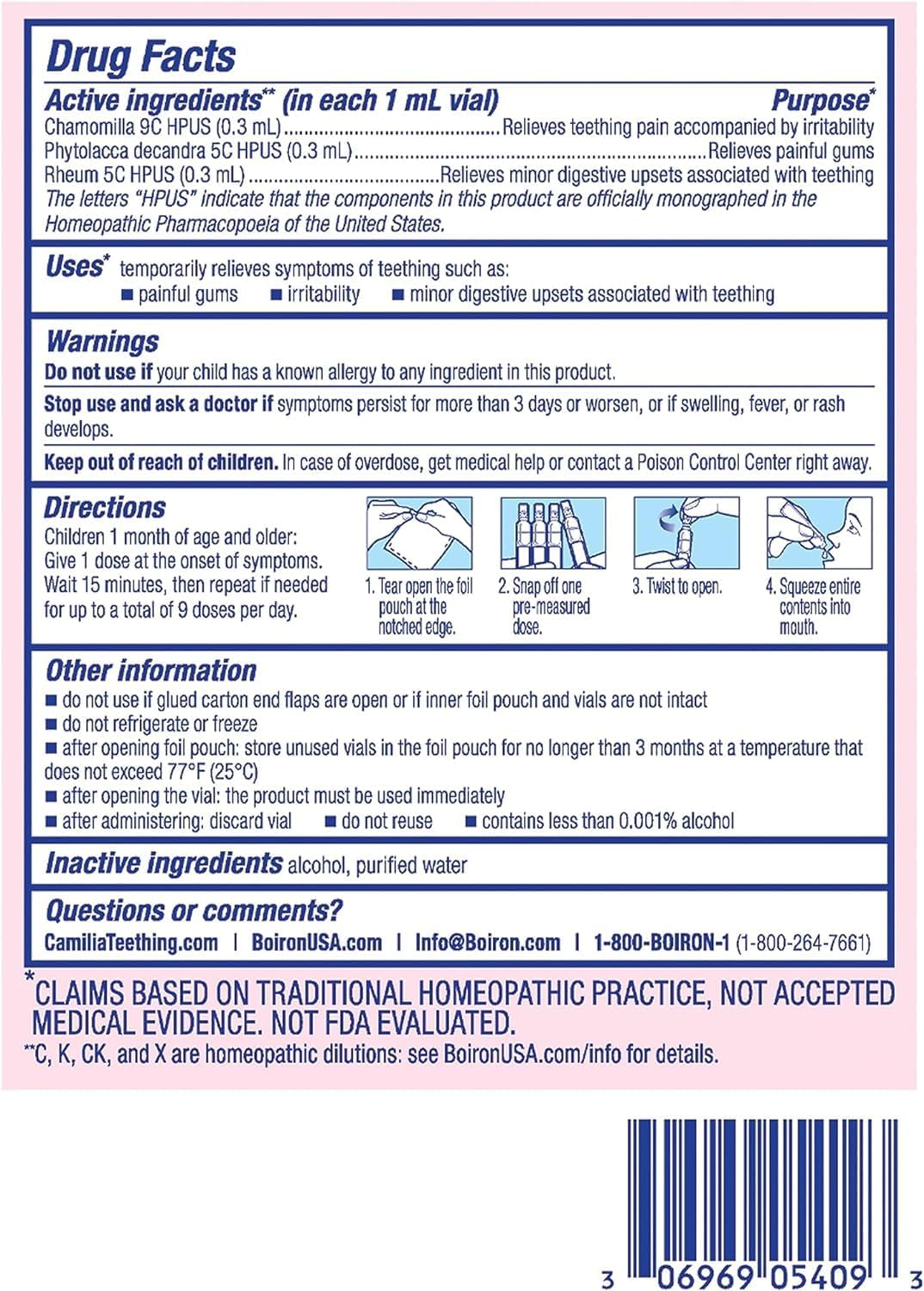 - Camilia's natural active ingredients include Chamomilla 9C HPUS (Relieves teething pain accompanied by irritability), Phytolacca decondra 5C HPUS (Relieves painful gums) and Rheum 5C HPUS (Relieves minor digestive disorders associated with teething).