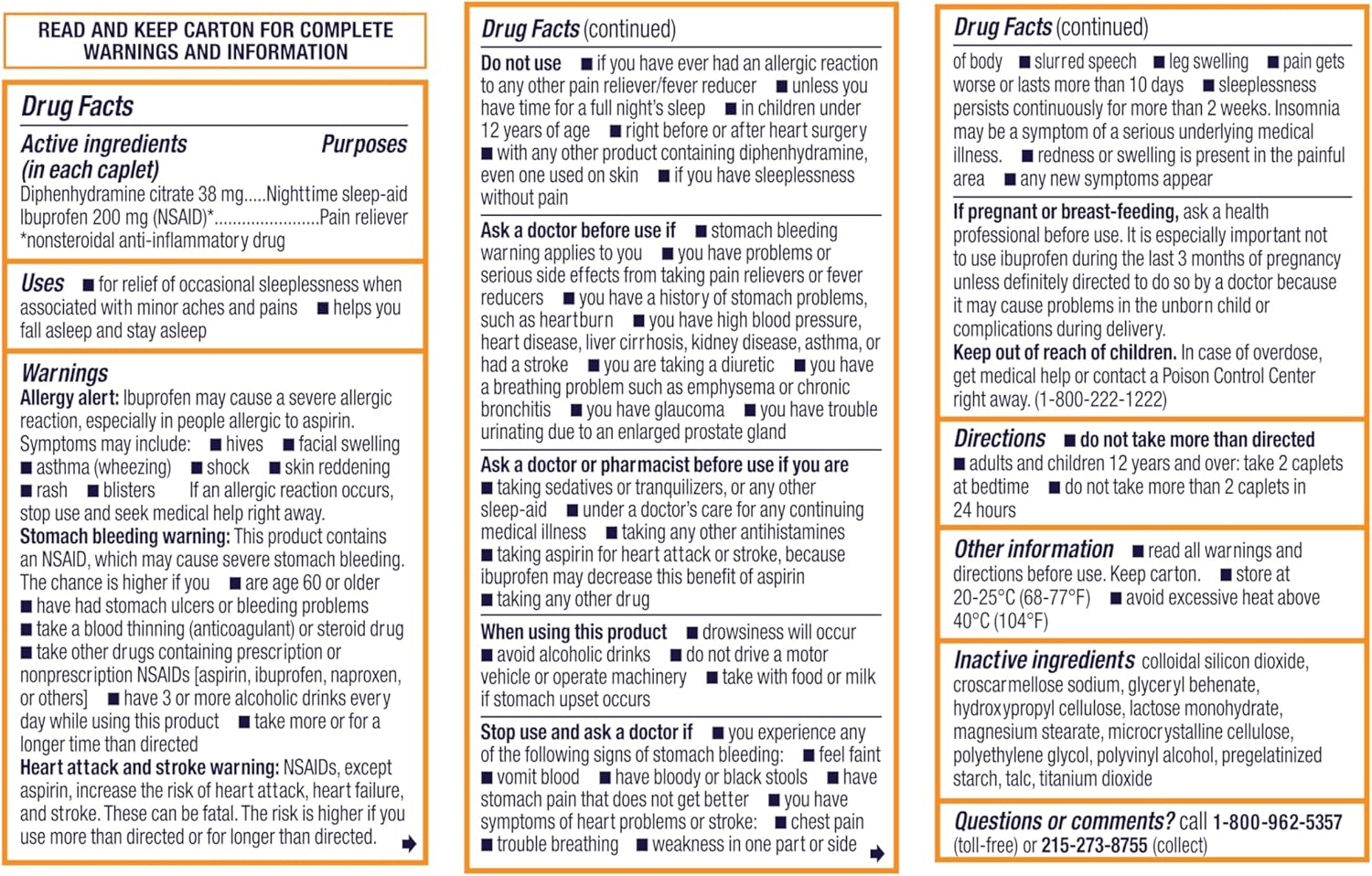 These ibuprofen/diphenhydramine caplets provide targeted pain relief with a nighttime sleep-aid so that you feel rested and ready to take on tomorrow
