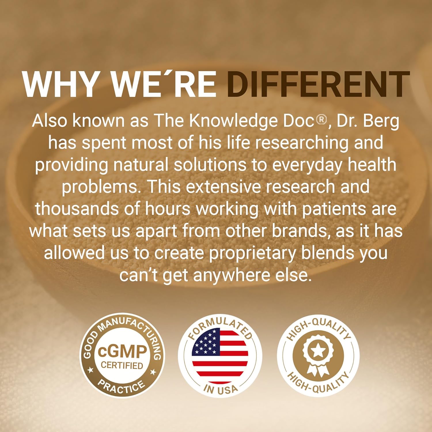 - 𝗪𝗛𝗬 𝗪𝗘’𝗥𝗘 𝗗𝗜𝗙𝗙𝗘𝗥𝗘𝗡𝗧 - Also known as The Knowledge Doc, Dr. Berg has spent most of his life researching and providing natural solutions to everyday health problems. This extensive research and thousands of hours working with patients are what sets us apart from other brands, as it has allowed us to create proprietary blends you can’t get anywhere else.