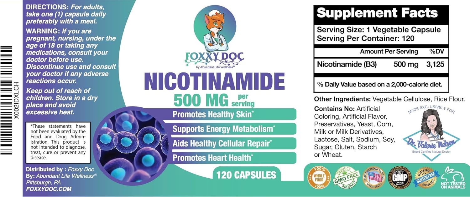Nicotinamide 500 mg - Vitamin B3 ? May Help Aging ? Boosts Energy ? Cellular & Skin Health - Gluten Free - 120 Veggie Capsules by Foxxy Doc