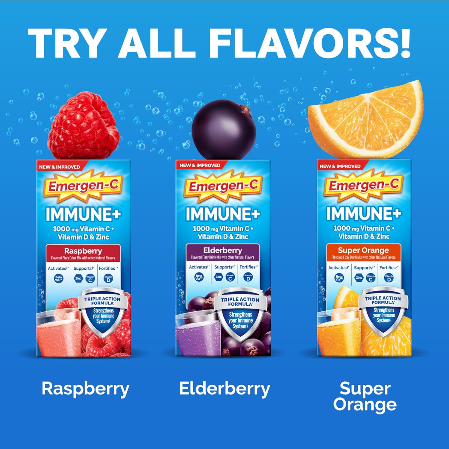 Emergen-C Immune+ Triple Action Immune Support Powder, BetaVia (R), 1000mg Vitamin C, B Vitamins, Vitamin D and Antioxidants, Raspberry – 30 Count