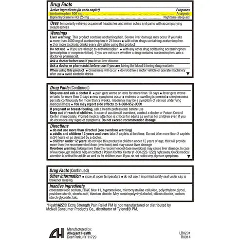 25 mg Diphenhydramine, a gentle, non-habit-forming sleep aid, helps you fall asleep and stay asleep while also relieving fever and minor aches and pain with the help of Acetaminophen.
