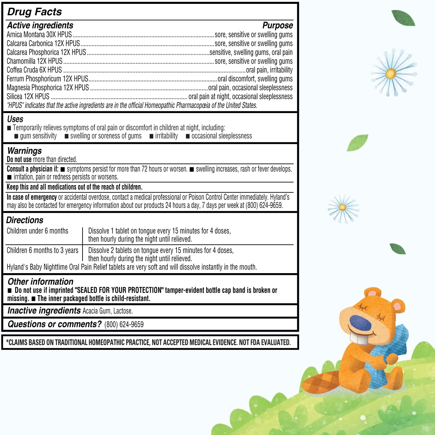Active Ingredients: Arnica Montana 30X HPUS: sore, sensitive or swelling gums, Calcarea Carbonica 12X HPUS: sore, sensitive or swelling gums, Calcarea Phosphorica 12X HPUS: sensitive, swelling gums, oral pain, Chamomilla 12X HPUS: sore, sensitive or swelling gums, Coffea Cruda 6X HPUS: oral pain, irritability, Ferrum Phosphoricum 12X HPUS: oral discomfort, swelling gums, Magnesia Phosphorica 12X HPUS: oral pain, occasional sleeplessness, Silicea 12X HPUS: oral pain at night, occasional sleeplessness. Inactive Ingredients: Acacia Gum, Lactose. "HPUS" indicates that the active ingredients are in the official Homeopathic Pharmacopoeia of the United States