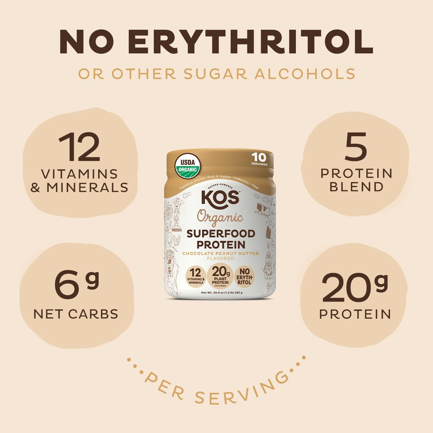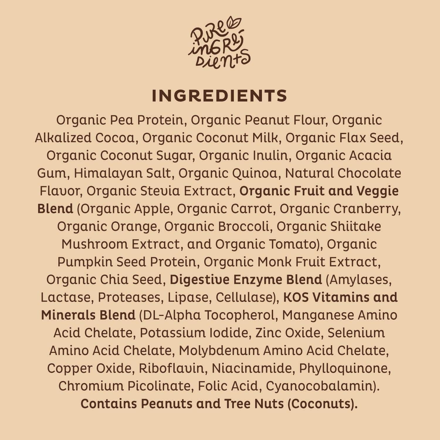 KOS Vegan Protein Powder, Chocolate USDA Organic - Low Carb Pea Protein Blend, Plant Based Superfood with Vitamins & Minerals - Keto, Soy, Gluten Free - Meal Replacement for Women & Men - 10 Servings