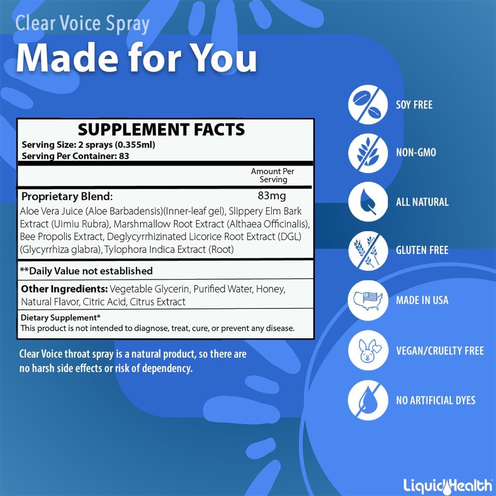 Reclaim your vocal freedom with LIQUIDHEALTH Clear Voice Vocal Throat Spray!
