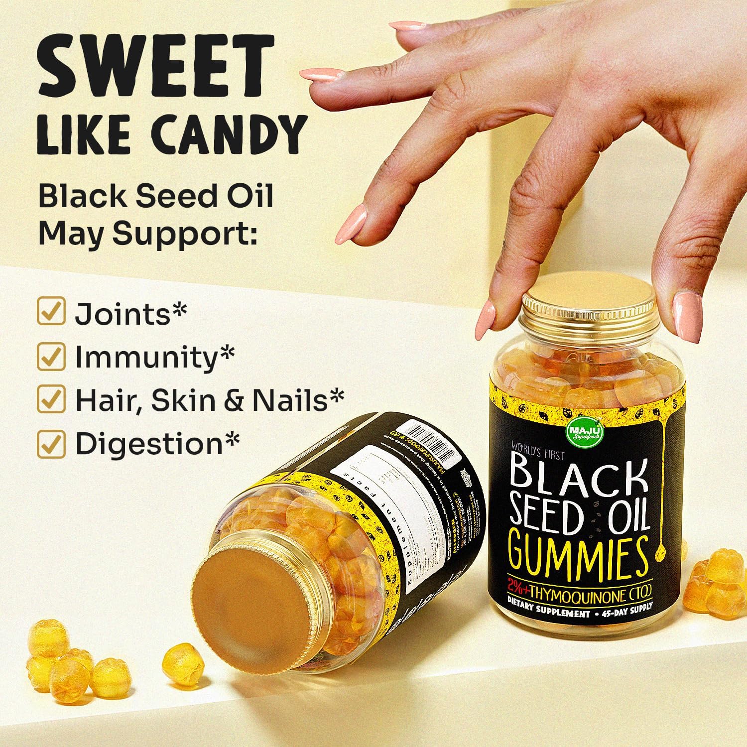 MAJU's Black Seed Oil Gummies, World's 1st, 2.5X Per BSO Gummy, Cumin Nigella Sativa Oil, Cold-Pressed, Potent Formula with Cinnamon Extract, Tasty, 500mg 90 ct
