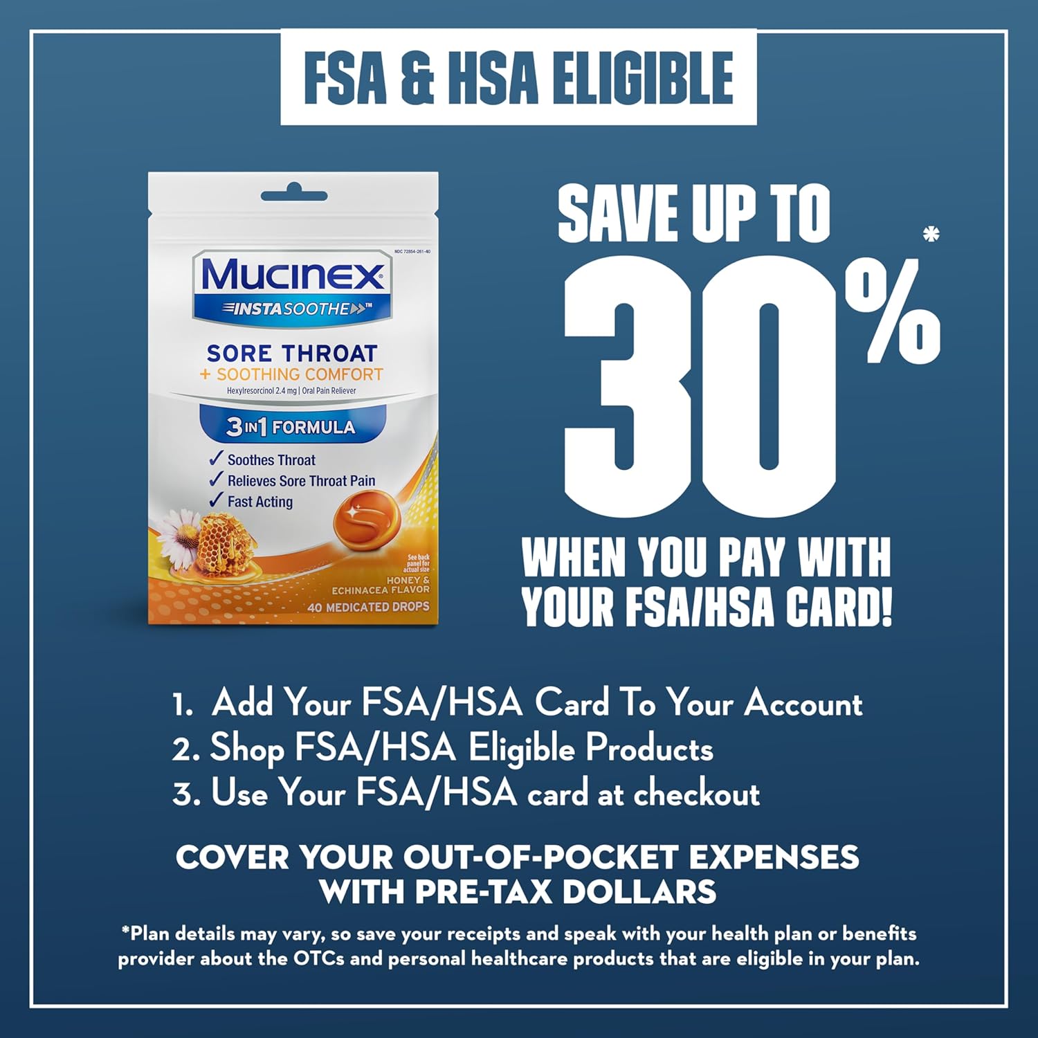 Introducing Mucinex® InstaSoothe Sore Throat + Soothing Comfort Honey & Echinacea Flavor Medicated Drops, made with real honey! Show your sore throat who's boss with our 3-in-1 formula that is Clinically Proven To Numb Pain Fast so you can get back to your day. Each medicated drop contains the active ingredient Hexylresorcinol, which helps to relieve occasional minor irritation and pain associated with sore throat, sore mouth and canker sores. This Powerful sore throat oral pain reliever starts to work in seconds & lasts for hours. FSA (Flexible Spending Account) and HSA (Health Savings Account) eligible. Save up to 30%. Cover out-of-pocket expenses with pre-tax dollars. Use as directed; Adults and children 6 years of age and over: Allow one lozenge to dissolve slowly in the mouth; may be repeated every 2 hours as needed or directed by a doctor or dentist. Children under 6 years of age: Do not use.