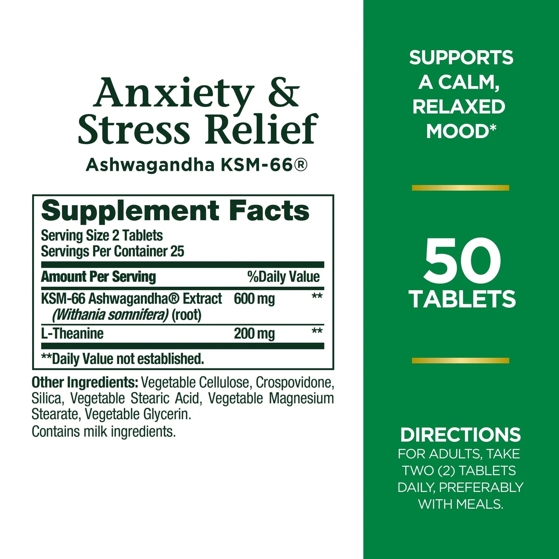 Nature’s Bounty Anxiety & Stress Relief Ashwagandha KSM 66, L-Theanine, Dietary Supplement, Tablets, 50 Ct