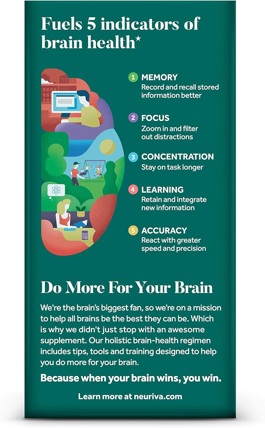 - MEMORY AND FOCUS SUPPLEMENTS FOR ADULTS: Investing in your brain health is essential, Neuriva offers a range of brain health* supplements specially formulated to support 5 indicators of brain health.* If you need a brain boost to help you focus at work or university, Neuriva has you covered with our range of brain supplements designed to promote brain health!