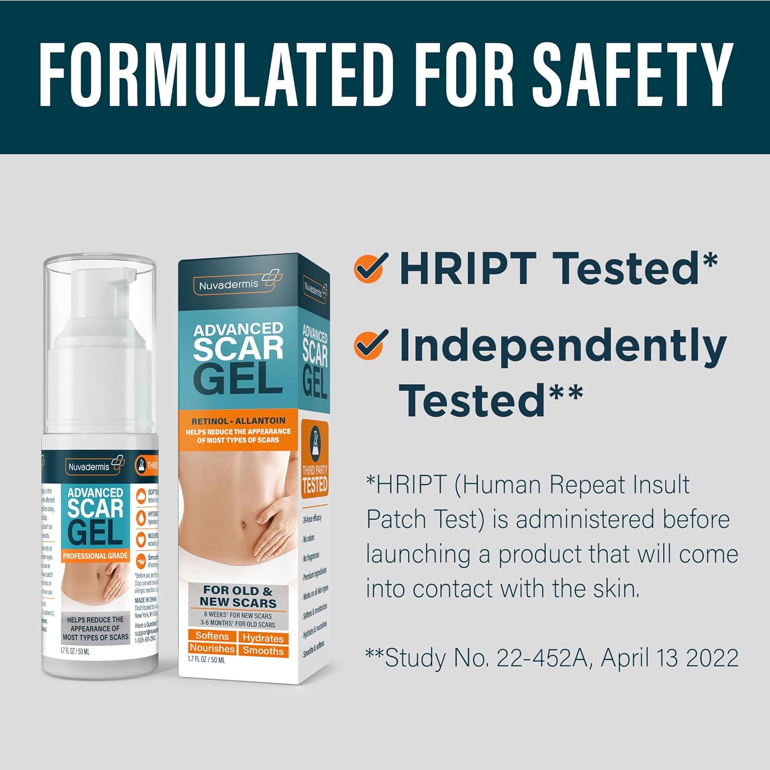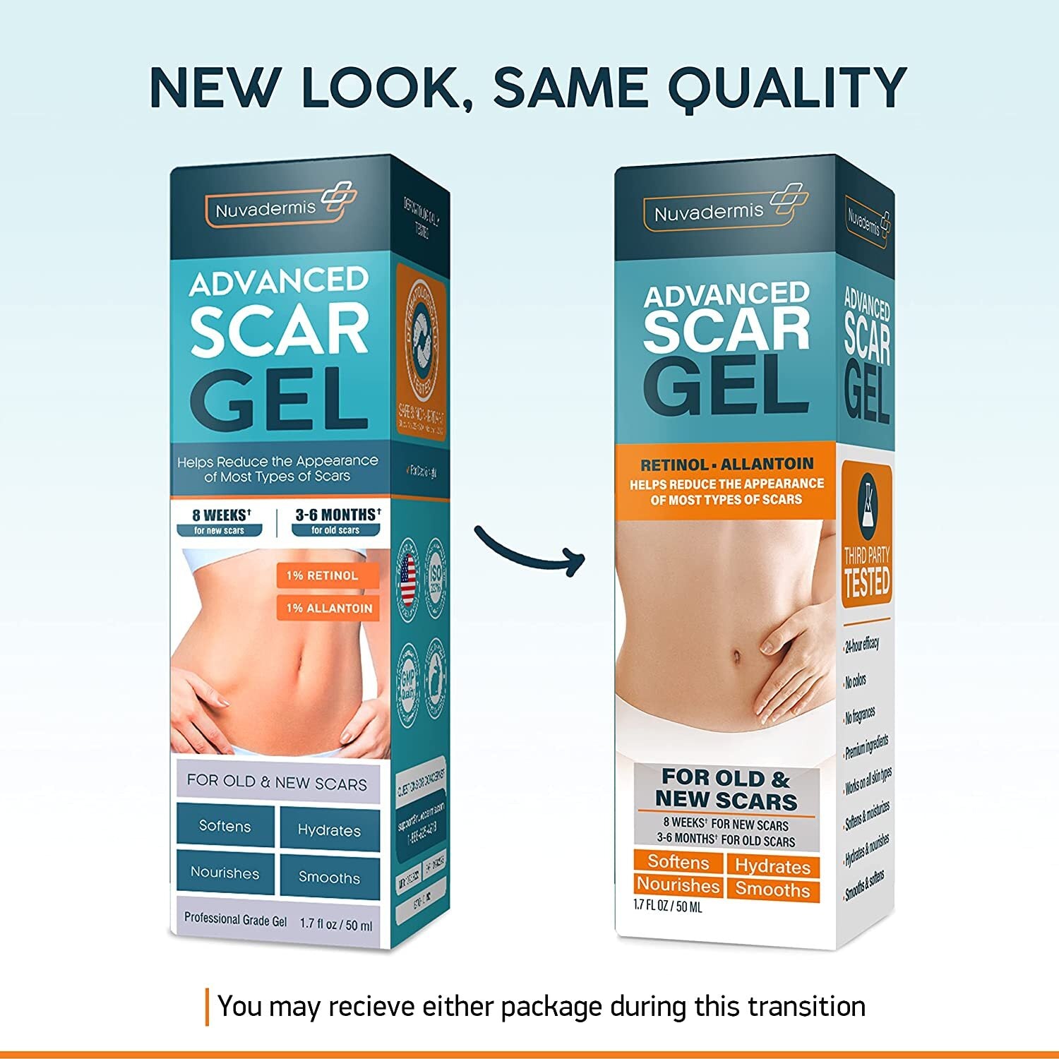 - Advanced Scar Gel: Nuvadermis Scar Gel promotes skin health, firmness, and elasticity to reduce the appearance of most types of scars, including surgical, burn, hypertrophic, and keloids. Made with retinol and allantoin.