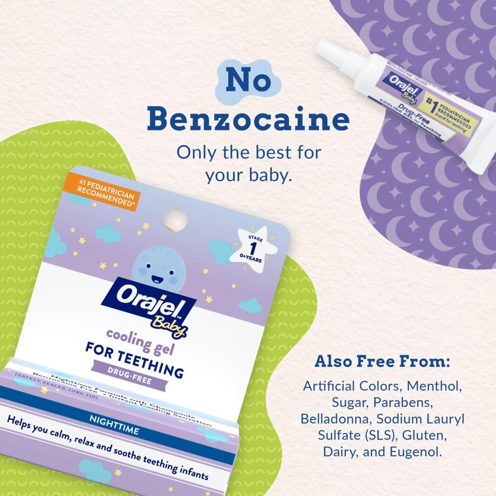 Orajel Baby Nighttime Cooling Gel for Teething, Drug-Free, 1 Pediatrician Recommended Brand for Teething, One .18oz Tube