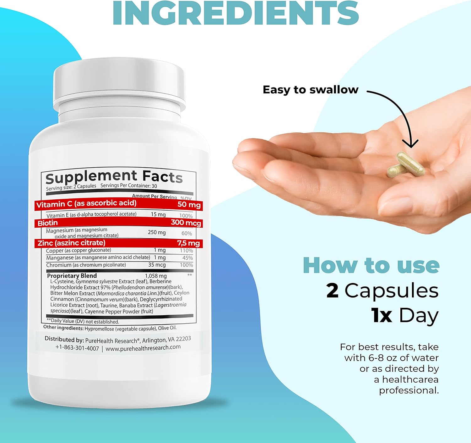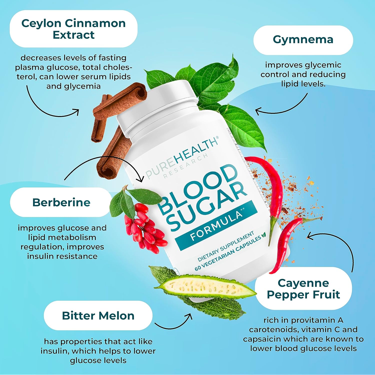 PUREHEALTH RESEARCH Glucose Balance Supplement - Blood Glucose Blend with Vitamin C, Magnesium, and Berberine for Men & Women, Increase Energy & Focus, Non-GMO, 60 Count