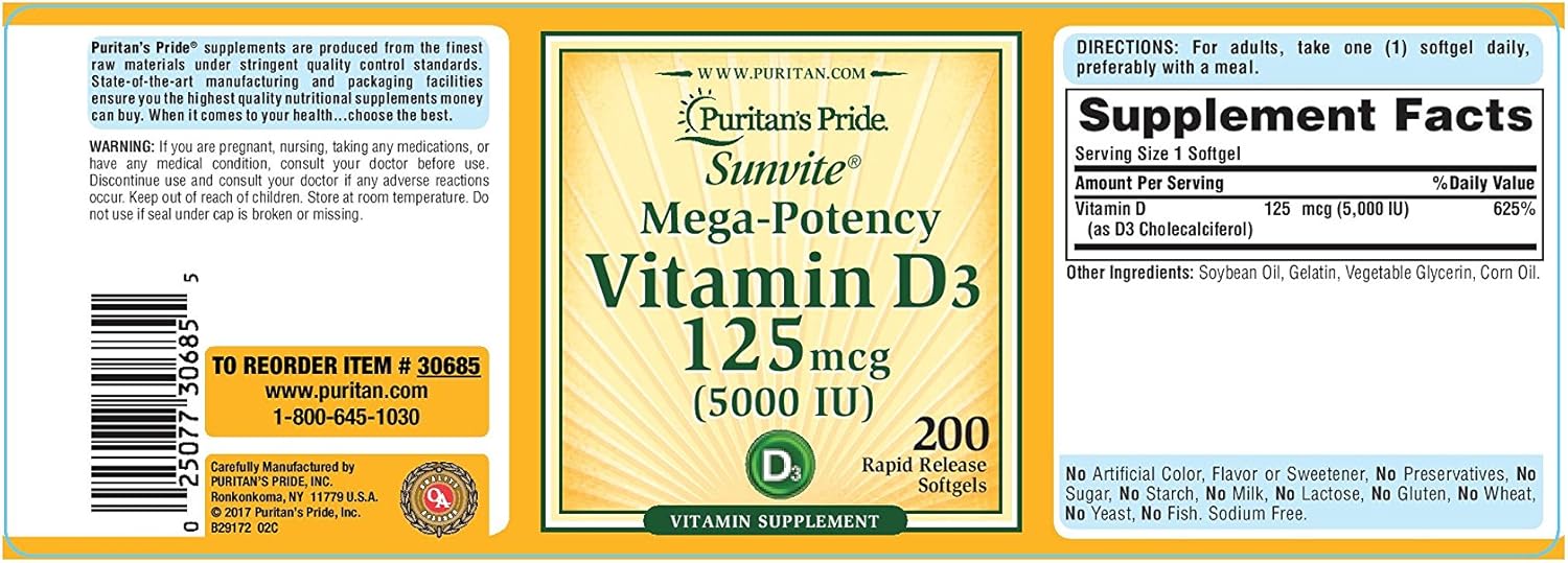 Puritan's Pride Vitamin D3 5000 IU - 200 Soft Gels