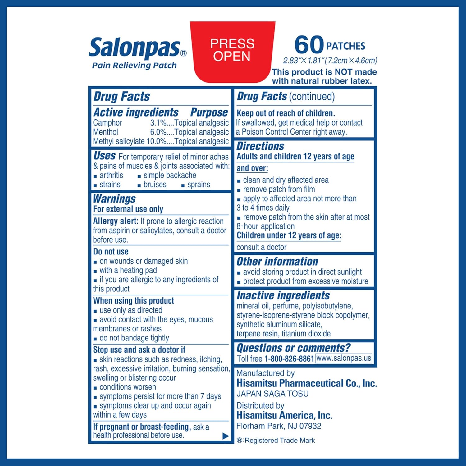 Salonpas Pain Relieving Patch for Back, Neck, Shoulder, Knee Pain and Muscle Soreness - 8 Hour Pain Relief - 60 Count
