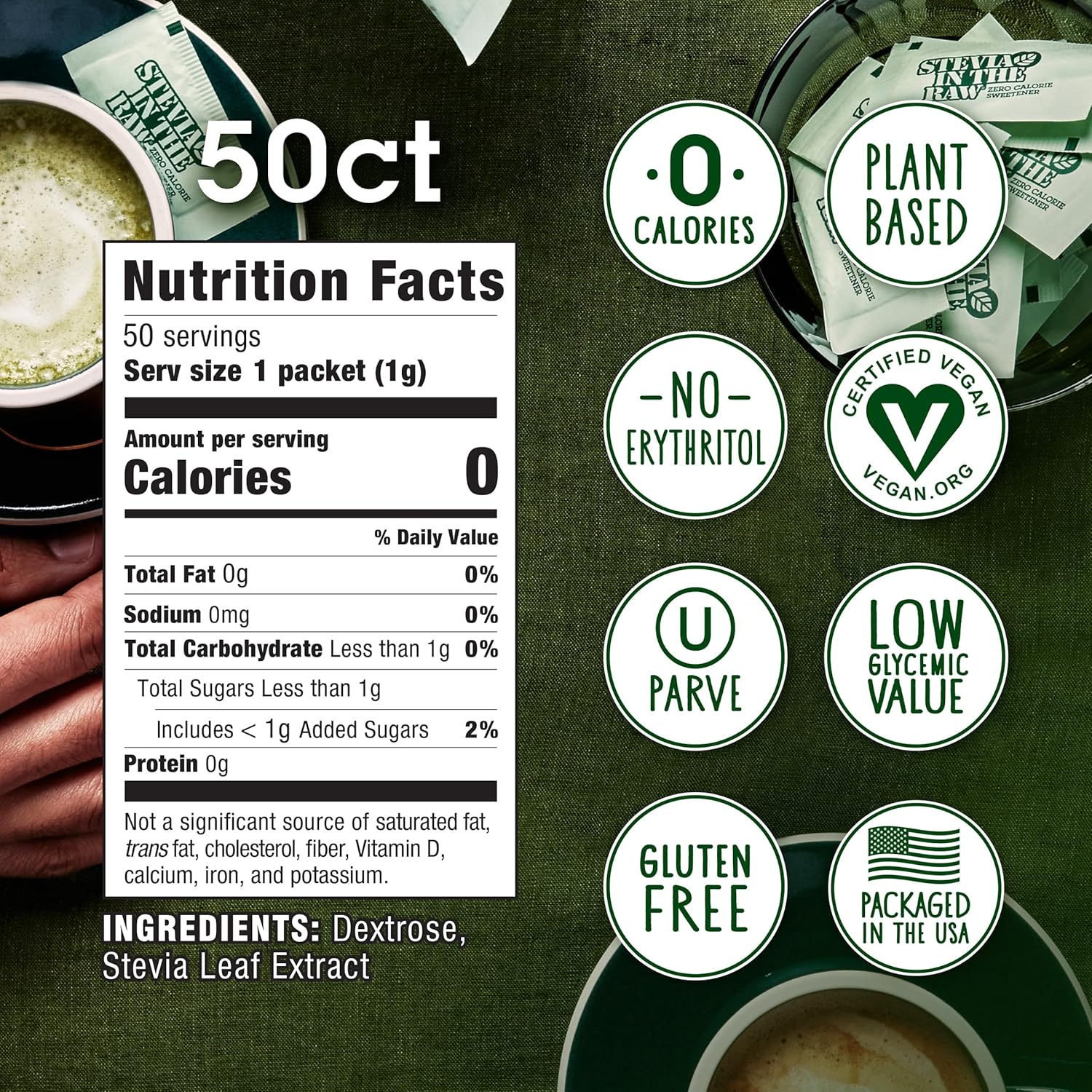 Stevia In The Raw, Plant Based Zero Calorie Sweetener, Sugar Substitute, Vegan, Gluten-Free, 50 Count Pack