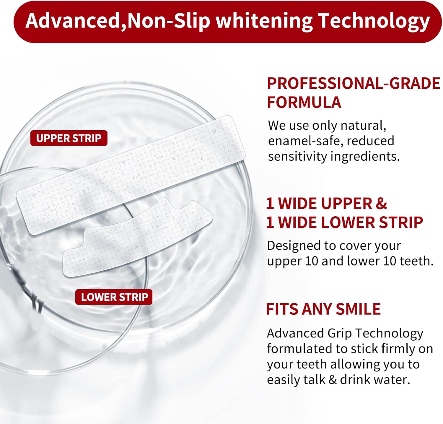 - Professional Teeth Whitening Strips: Use the new professional teeth whitening ingredients, peroxide-infused gel, teeth whitening strips can quickly and thoroughly dissolve tooth discolorations without sensitivity.