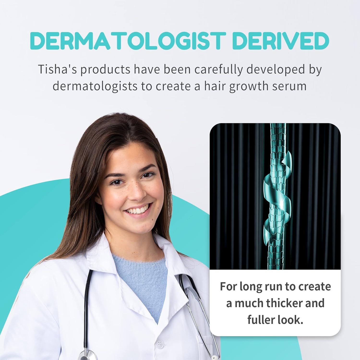 - DERMATOLOGIST DERIVED: Tisha's products have been carefully developed by dermatologists to create a hair growth serum that works in the long run to create a much thicker and fuller look.