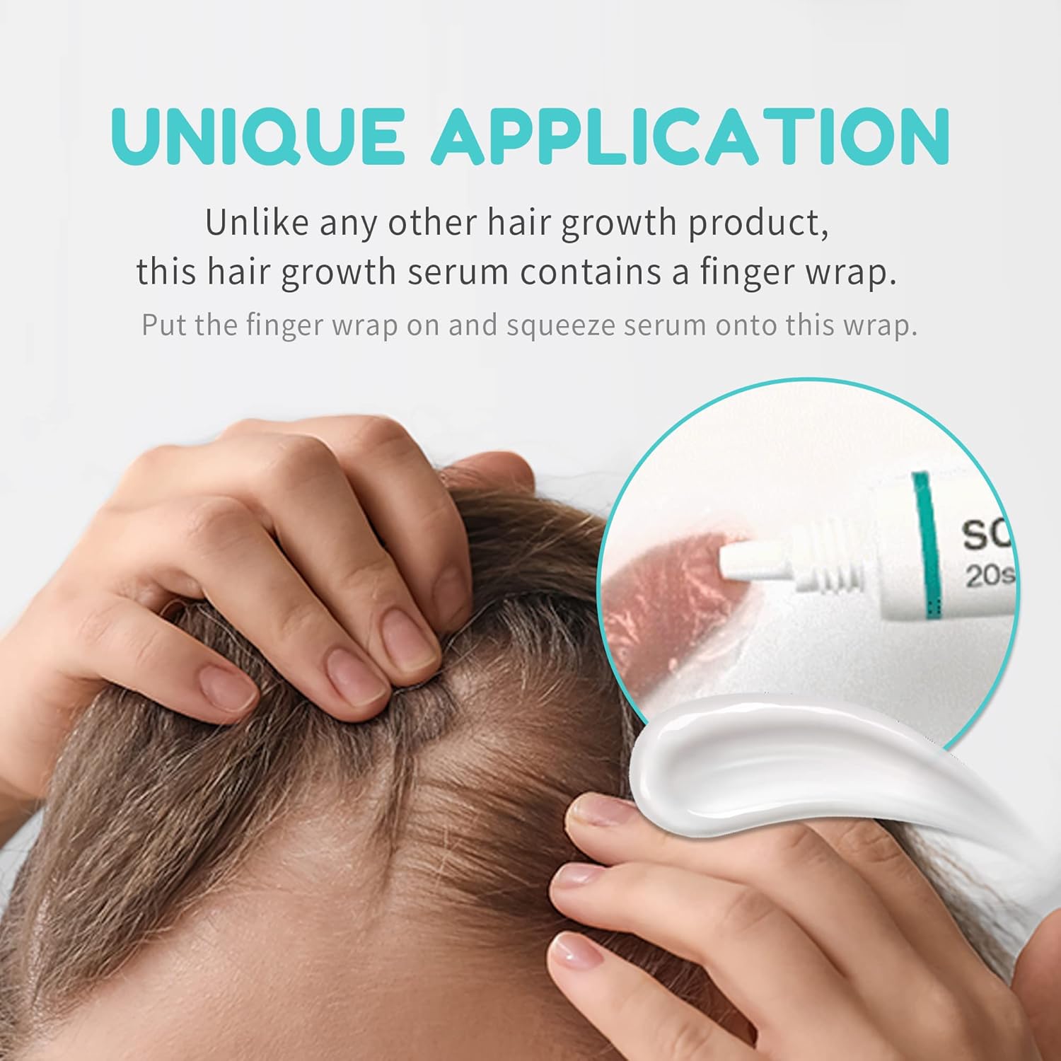 - UNIQUE APPLICATION: Unlike any other hair growth product, this hair growth serum contains a finger wrap. Put the finger wrap on and squeeze serum onto this wrap. Squeeze according to the area in need of application. Rub it 7 times, in order for the serum to be absorbed completely. Apply daily prior to sleep.