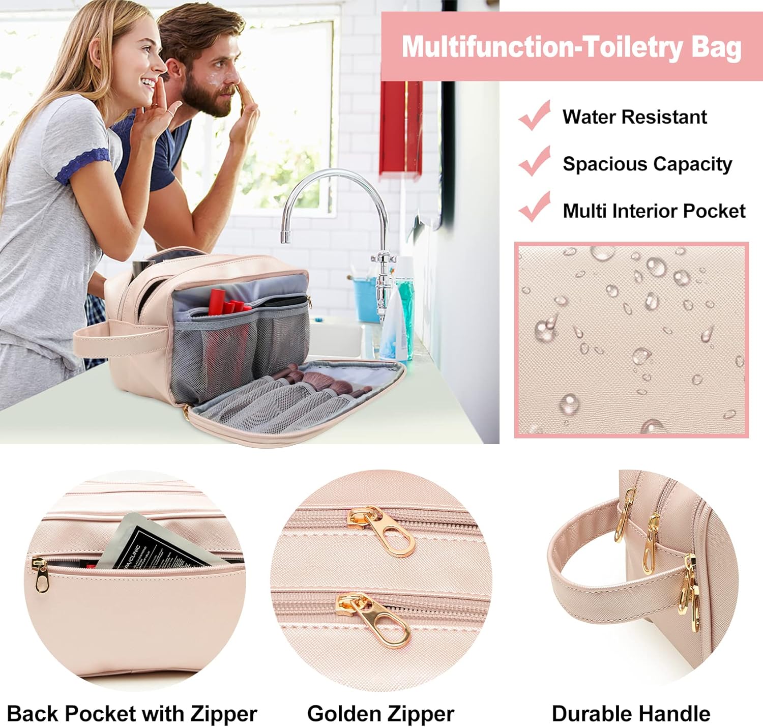 - Well-made Travel Bag for Travel Essentials - Crafted in charming pink saffiano eco-leather, sturdy gold tone zippers and quick-drying moisture absorption lining with well-padded design, this travel makeup bag has three main zipped compartments with plenty of elastic slip mesh pouches for your makeup brushes and tools so you quickly locate your beauty essentials, and even an elastic strap to keep your bottles in place when travelling, while the durable and smooth zips provide excellent longevity