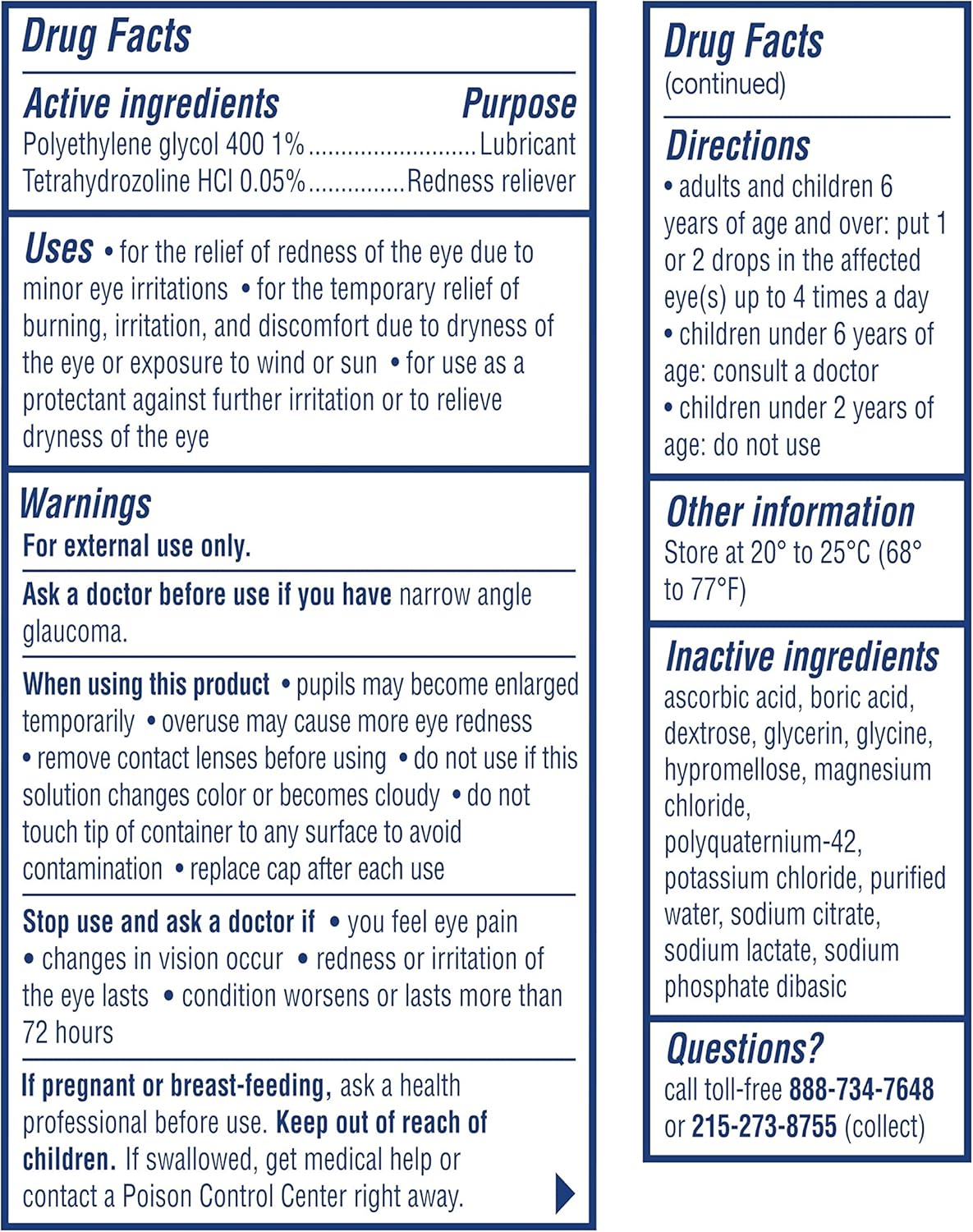 - Formula contains 1% polyethylene glycol 400 and 0.05% tetrahydrozoline HCl which helps lubricate, refresh and relieve red irritated eyes