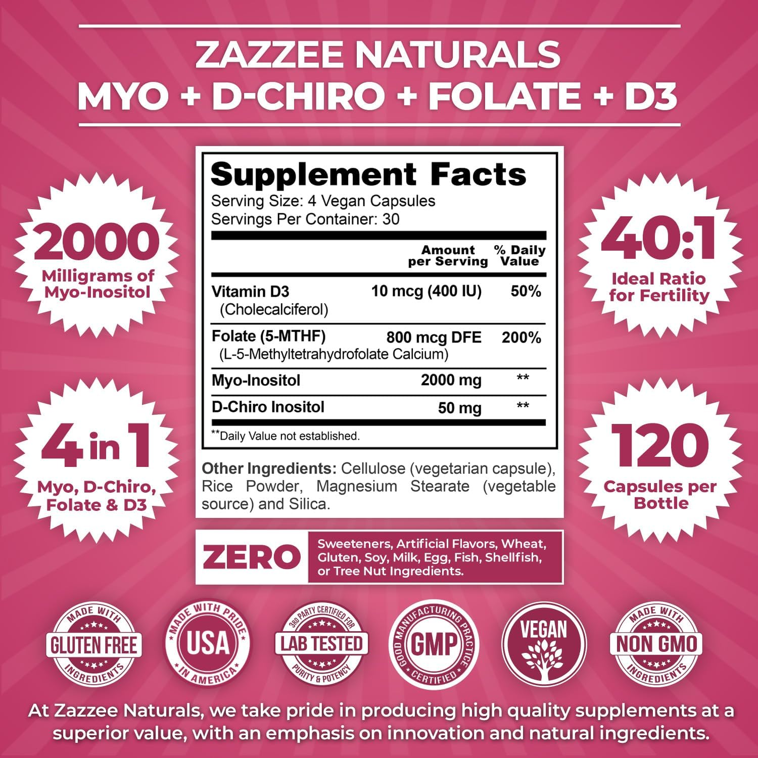 - 30 DAY SUPPLY / 120 CAPSULES PER BOTTLE: Designed specifically for fertility and reproductive support, Zazzee Myo-Inositol + D-Chiro, with Folate + Vitamin D3 contains 2000 mg of Myo-Inositol and 50 mg of D-Chiro Inositol, in the ideal 40:1 ratio. In addition, we’ve added 800 mcg of Folate (5-MTHF) and 400 IU of Vitamin D3, both of which have proven track records for being effective for enhanced fertility.